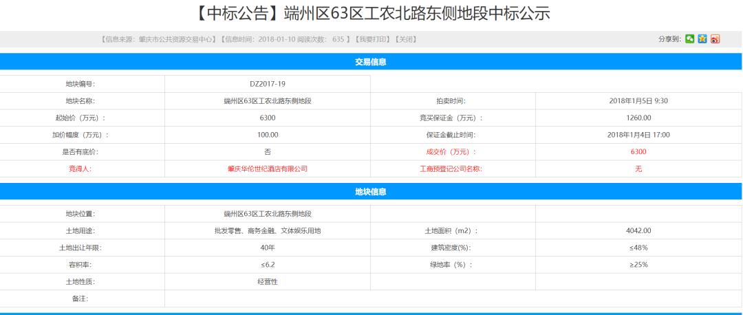 次年,即2018年1月,肇庆华伦世纪酒店有限公司以总价6300万,拿下该4042平三旧改造地块,容积率要求≤6.2。