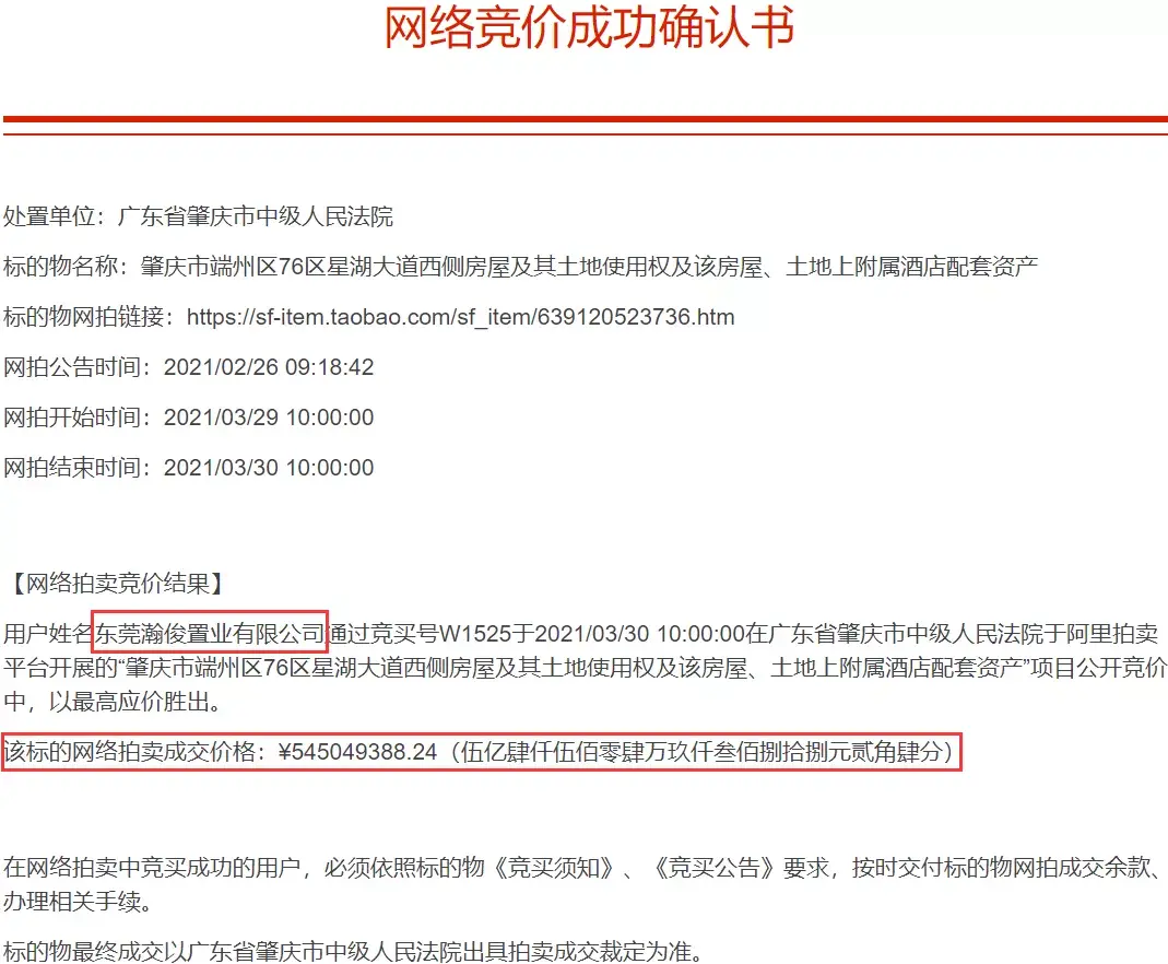 值得一提的是,同样是五星级酒店身份的肇庆奥威斯酒店,在阿里拍卖平台法拍,今年2月二拍成功,竞得人为东莞瀚俊置业有限公司,成交价约5.45亿。
