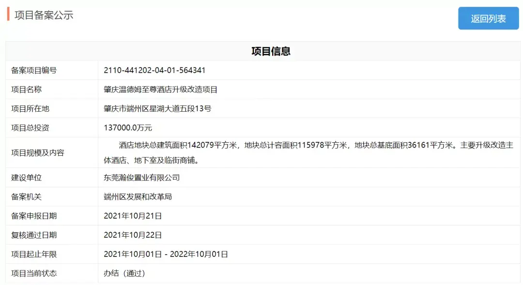 10月份,肇庆温德姆至尊酒店升级改造项目备案,建设单位正是东莞瀚俊置业有限公司,项目主要升级改造主体酒店、地下室及临街商铺,总投资13.7亿。