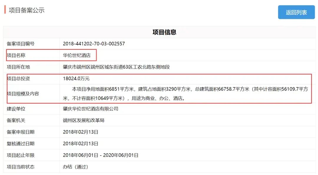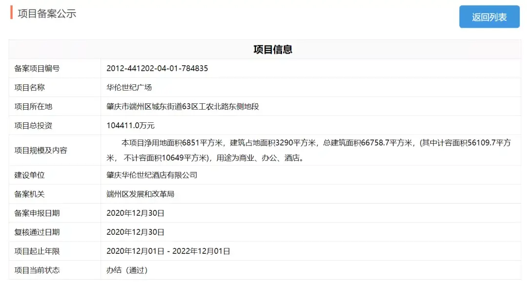 下一次有华伦世纪酒店的消息,到了2020年12月,华伦世纪广场备案,项目总投资额增至104411万。