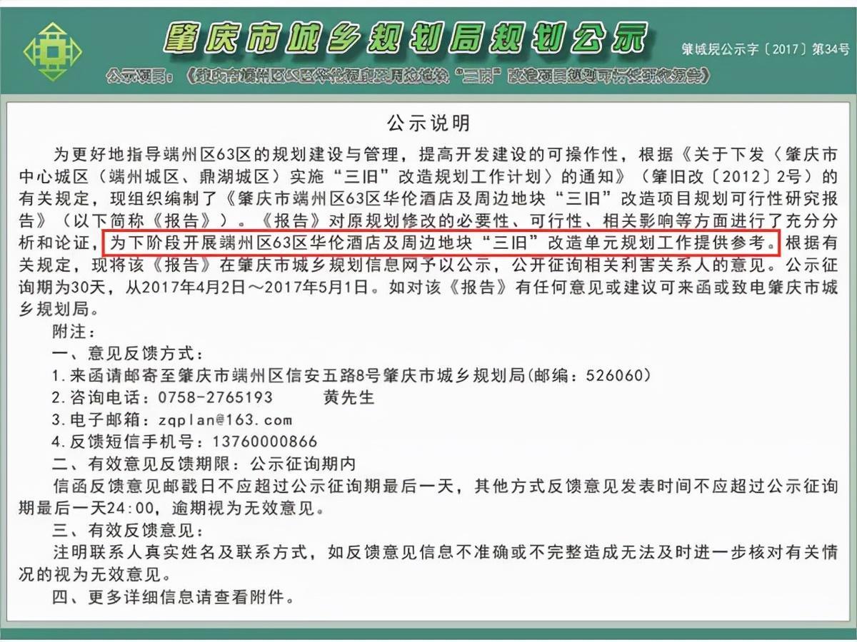 2017年4月,市城规局发布《肇庆市端州区63区华伦酒店及周边地块“三旧”改造项目规划可行性研究报告》。