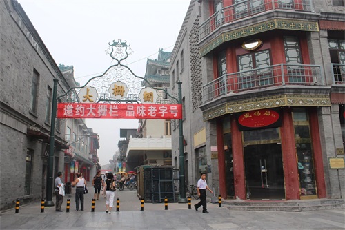 北京市大栅栏历史文化街区,简称“大栅栏”,读作“dà shí lànr”,位于北京市西城区前门大街西侧,西至南新华街,南起珠市口西大街,北至前门西大街,占地面积约1.15平方千米。大栅栏建于明永乐十八年(1420年),时称廊坊四条;明弘治元年(1488年)在胡同口设立栅栏,故改称“大栅栏”;清末此地商业发达,形成商业街区 [1-2] 。