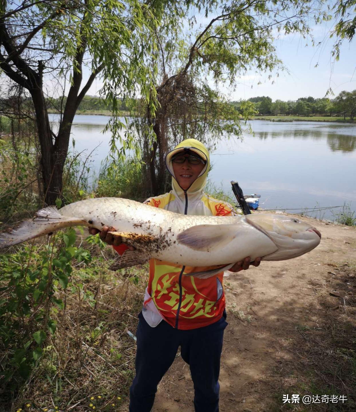 期间浮漂有个小顿口,离得远没理它。吃完继续,大概12点吧,一个黑漂,抬杆中鱼。感觉一点劲都没有,和朋友说估计是个小鲤鱼,溜了半分钟不到就出水了,我去,这个大脑袋,小腿有点软啊。没见过这么大的鱼啊,溜鱼越发的小心,有手绳,但是附近芦苇较多,进去估计鱼也跑了。这个鱼真是给面子,几次冲刺都领回来了。慢慢拉锯,几次到了水边,一见抄网就往里面扎,大线拽的吱吱响,心里紧张急了。大概溜了40分钟,累死我了,钓鱼服都湿了,满脸是汗。想让朋友帮忙溜会,他说:算了,跑了我可受不了。最后有惊无险安全入护。连拍照的力气都没有了,目测应该有30斤左右吧。