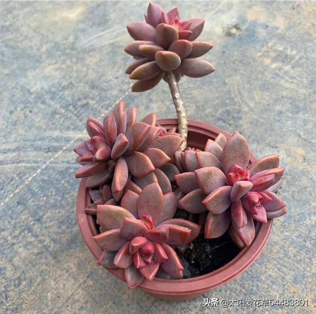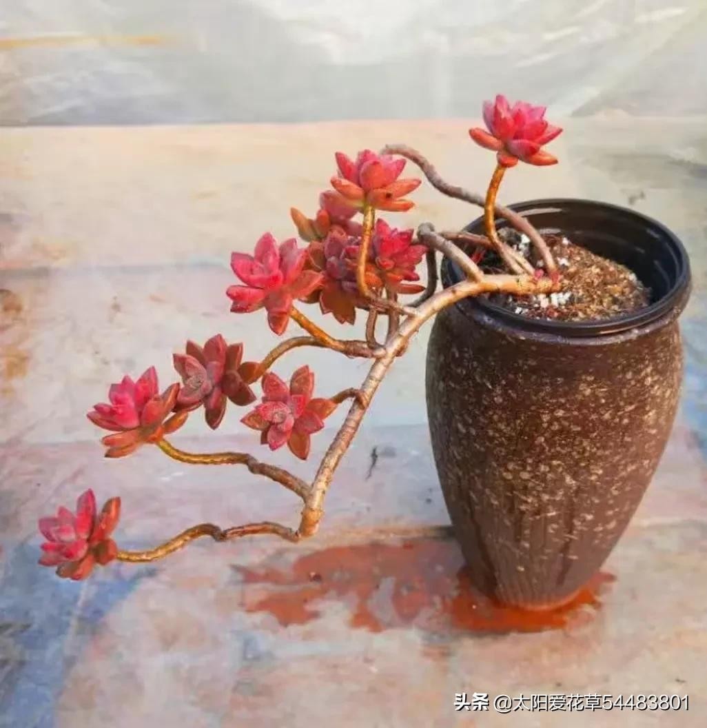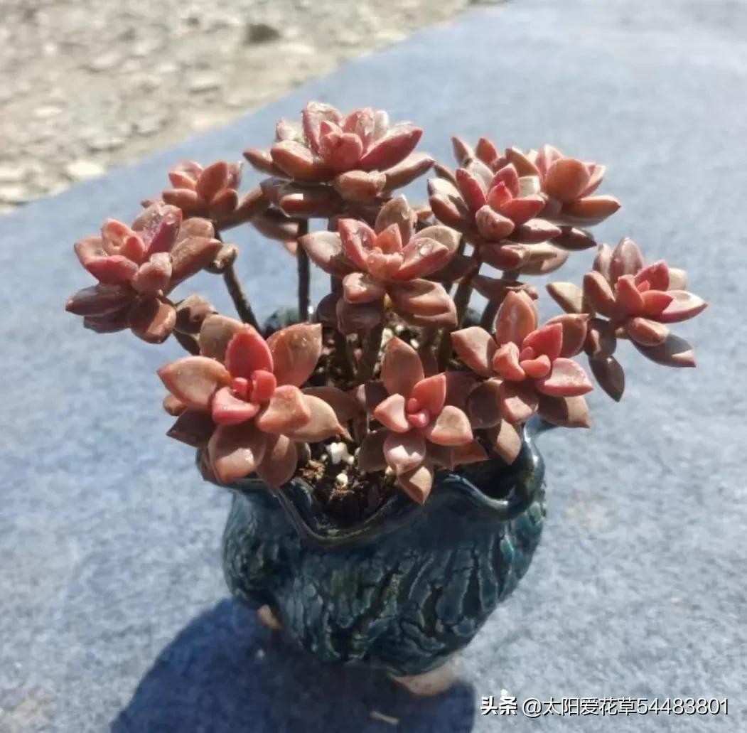备注:只要温度合适,露养的姬胧月颜值非常漂亮,它是见阳光叶片就变色,长期颜值在线,只是夏季的颜色会暗一些,而秋冬温度低,在光照充足下,姬胧月会呈现紫红色、褐红色。加上娇娆的老桩,显得霸气又美丽。