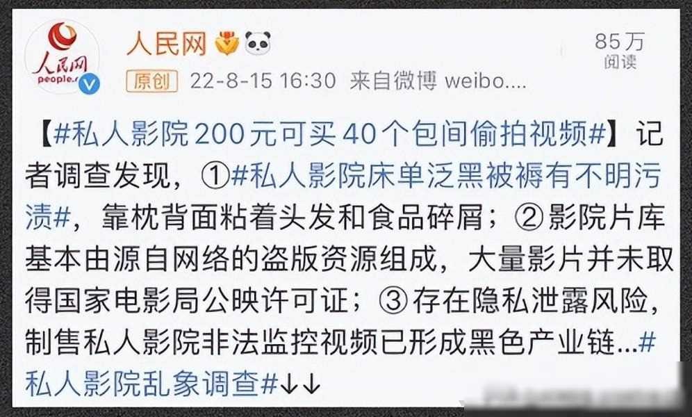 而私人影院的违规行为不仅局限于版权问题。有些经营者甚至下载了不适宜的影片,包括“三级片”,进一步深化了私人影院的问题。更为严重的是,一些私人影院经营者甚至利用隐秘摄像头偷拍顾客,尤其是情侣之间的不雅视频,形成了一条危险的产业链。