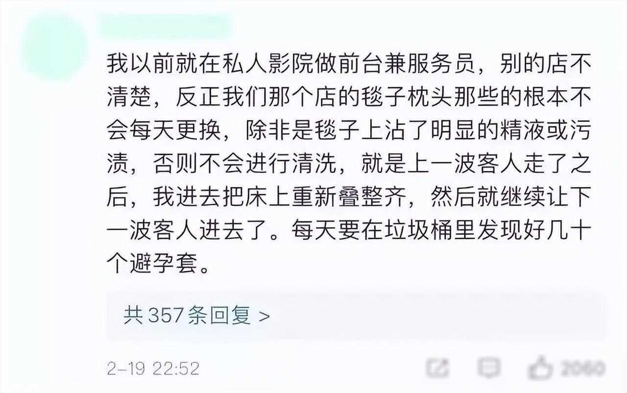 此外,私人影院的卫生问题也备受诟病。相较于酒店等场所,私人影院的卫生管理常常不到位,床单等用品很少更换,存在卫生隐患,给顾客带来身体健康的风险。