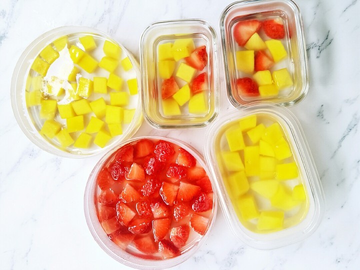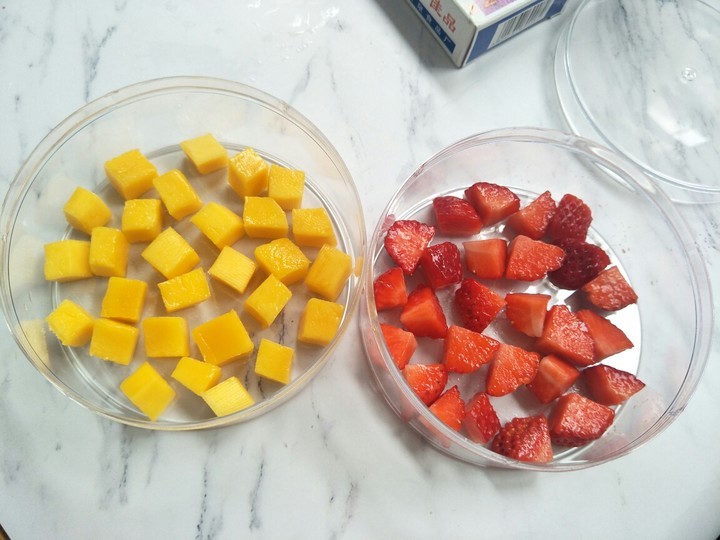 1、制作果冻加入的水果可以根据个人的喜好调配,之所以放入芒果和草莓,是因为现在正是其上市的季节。