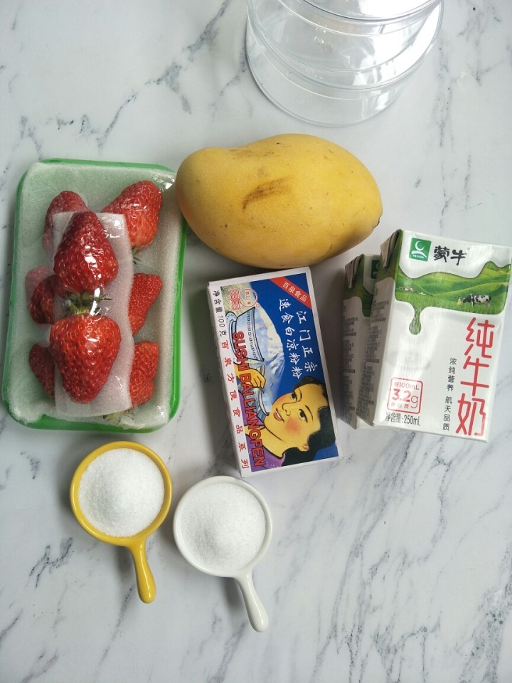 【所需食材】清水,牛奶,白凉粉,白糖,芒果,草莓。