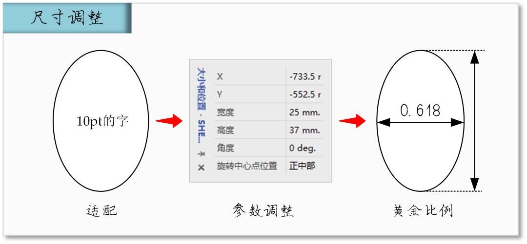 首先先在空白面板上绘制一个椭圆和一个10pt的文本,这个文本要作为韦恩图的标注,椭圆的大小要与这个文本适配,椭圆缩放至差不多大小时,通过0.618比例控制长宽。