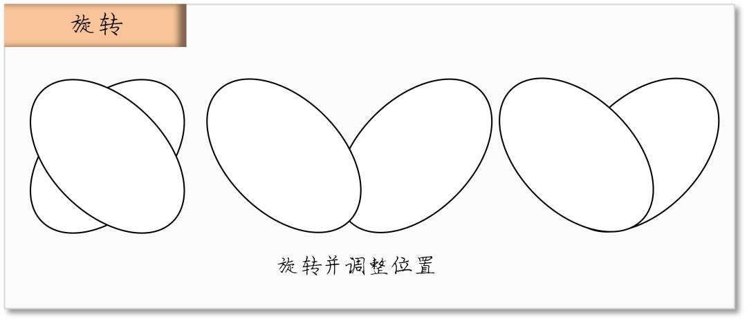 将1号椭圆与2号椭圆重叠,3号椭圆与4号椭圆重叠。1号和2号分别旋转45°和-45°,3号和4号也分别旋转45°和-45°,旋转后调整一下3号和4号的横向位置。