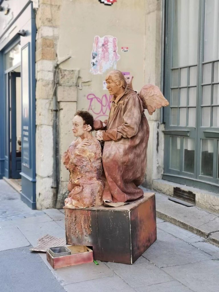 上面的天使是活人,下面的是雕塑,容易混淆,静止状态,但眼珠了会转来转去,突然说句话,惊得游人乱叫。