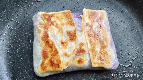 5、大火热锅,平底不粘锅涂刷薄薄的食用油,待热油后转中火,将包裹好的紫薯手抓饼,放入锅中煎炸,待煎至表皮微微金黄,即可切开食之;