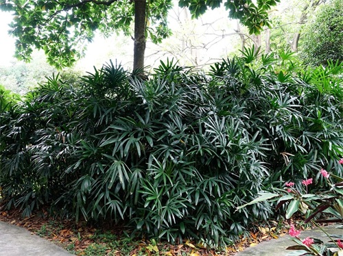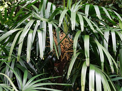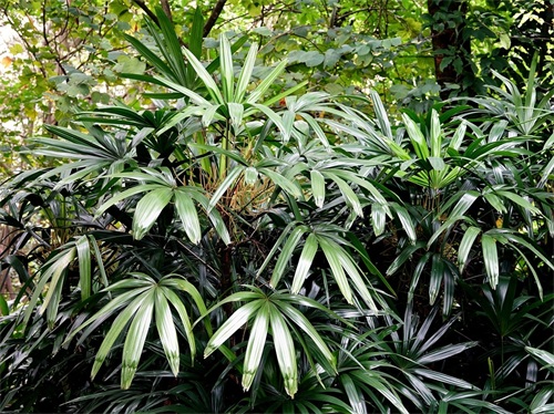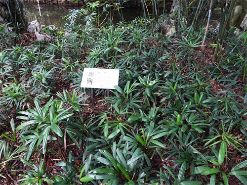 2019年4月中旬,我游览佛山雷岗公园时,看到一片茎像棕榈,叶子有点儿像竹的小苗,小苗中插着说明标牌,说这些小苗是棕榈科棕竹属植物棕竹Rhapis excelsa。