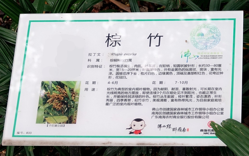 标牌还介绍说,棕竹为典型的室内观叶植物。因为耐阴、耐湿、喜散射光,可长期在室内光线明亮的地方摆放,即使连续3个月在暗处见不到阳光,也能正常生长,并能保持其浓绿的叶色。棕竹丛生挺拔,枝叶繁茂,姿态潇洒,叶形秀丽,四季青翠,似竹非竹,美观清雅,富有热带风韵,为目前家庭栽培最广泛的室内观叶植物。