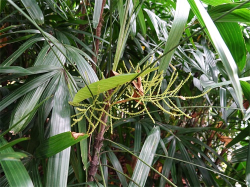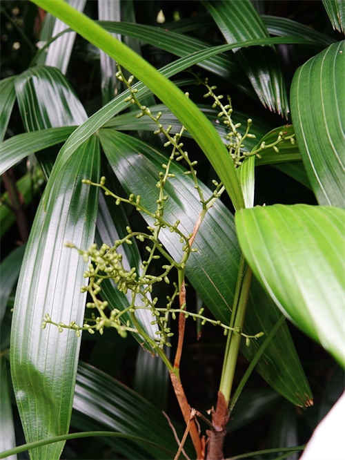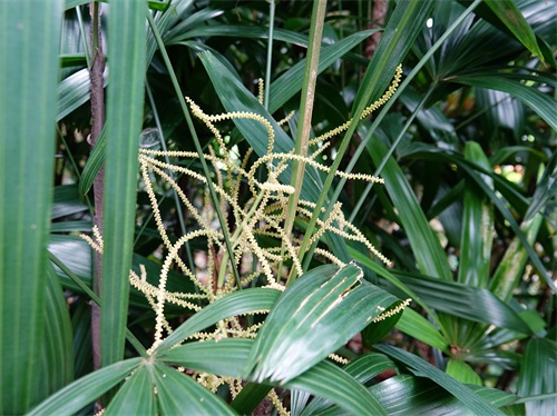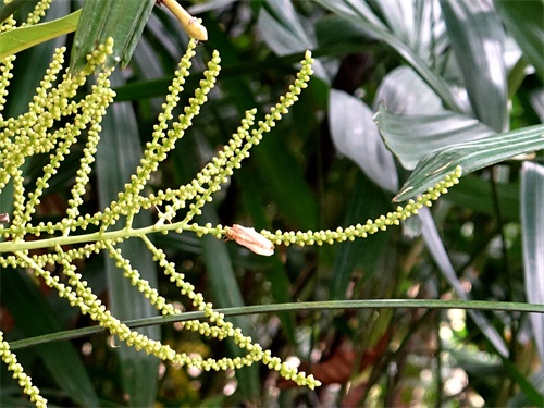 5月初,我在广州华南植物园看到长了花苞的棕竹,小球般的花苞密布在长而细的花序上。由于它的花梗有分枝,分枝上又有小分枝,小分枝往往弯曲,就显得很杂乱,没有美感。另外,还看到一种稍有不同的,它的花枝要短一些,更硬朗,花苞也不很密集,不知是否又是一个品种。