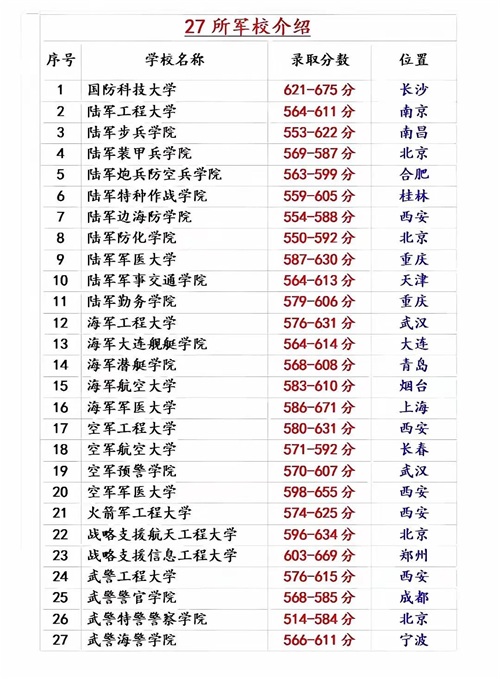 全国27所军校排名更新:国防科大居首,陆军医大9,火箭军工大21