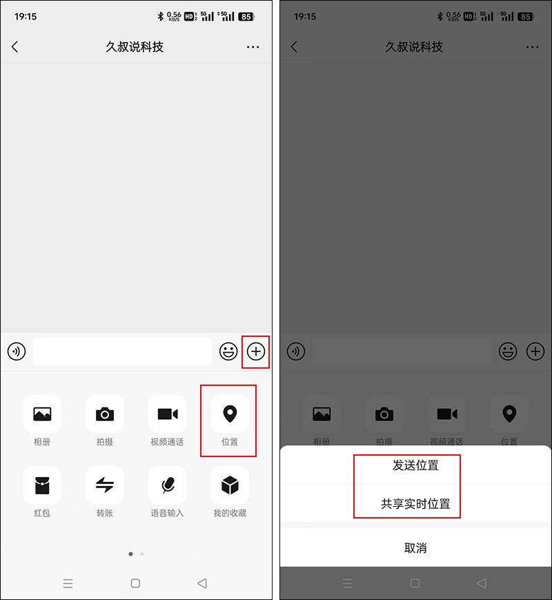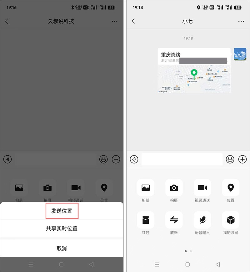 先说一下定位功能启动方法。点进微信好友的聊天窗口,然后点最右边的【+】,然后再点一下【位置】就会看到有【发送位置】和【共享实时位置】这两个功能,这两个功能都是隐藏有妙用的,继续往下看。
