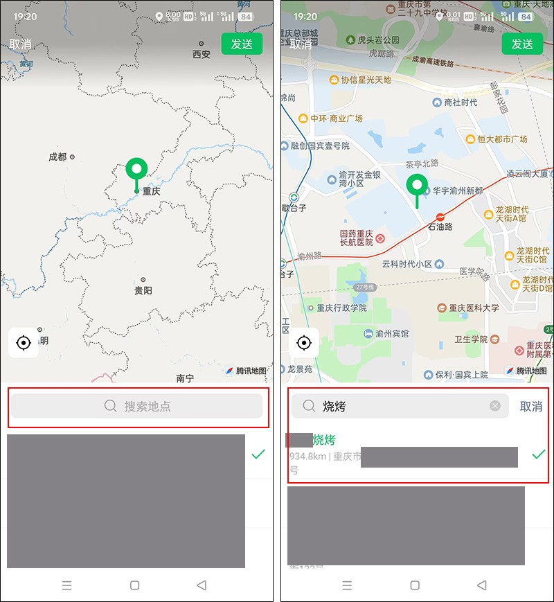 另外,这个功能还有个隐藏用法,快速给朋友提供某地的定位,对方点进去就可以导航到该地点。比如朋友来我们的城市旅游,一起约好了晚上吃烧烤,点进【发送位置】后,在【搜索地点】那输入烧烤店的地址,然后再点右上角的【发送】,对方收到后,点进你发过去的定位就可以导航到烧烤店了。
