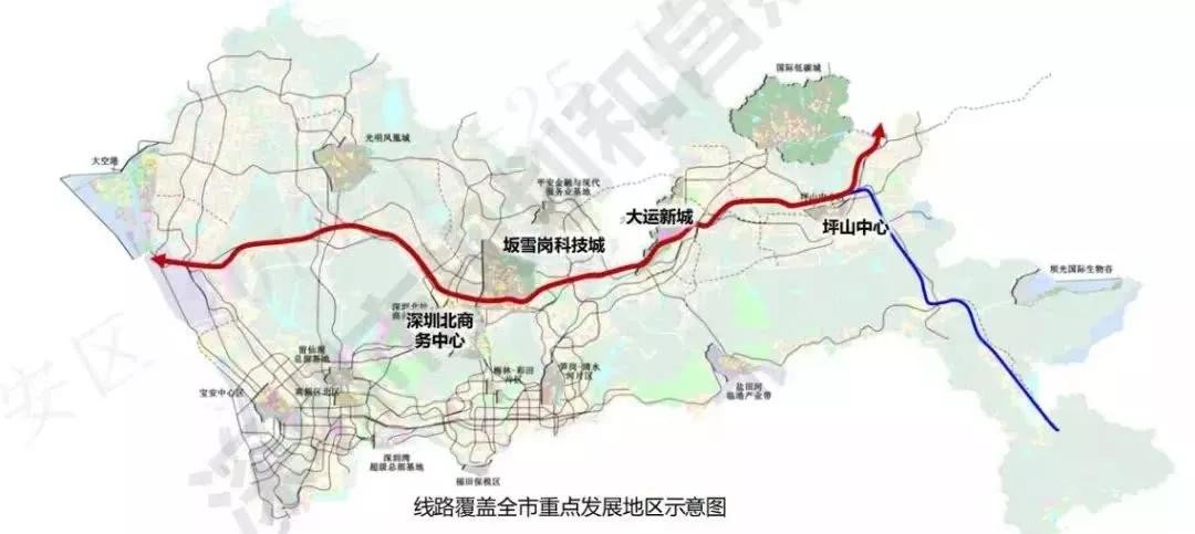 深圳境内重点片区覆盖:线路串联全市18个重点片区中的深圳北商务中心、坂雪岗科技城、 大运新城、坪山中心,可有效支撑片区发展。