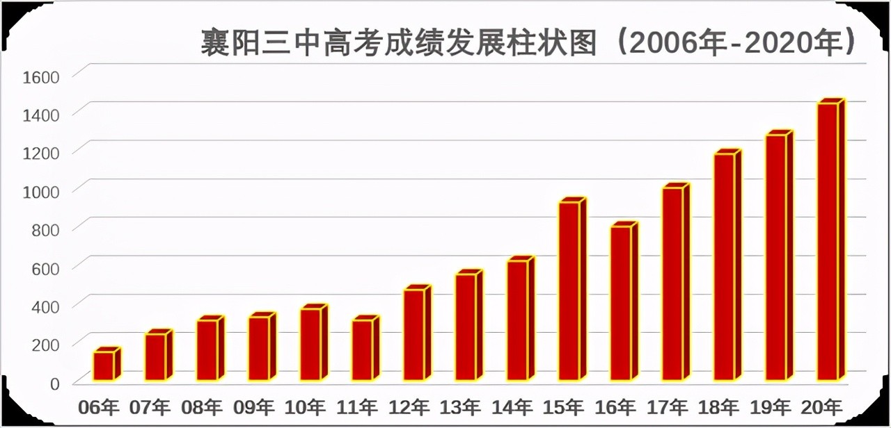 自2017年突破千人大关以来,年年高位突破、刷新纪录,高增幅、大跨步地为襄阳教育贡献三中力量。“低进高出、高进优出、优进尖出”极大提升家庭幸福指数。较中考成绩提升100分的文科18人,理科78人。例如,韩骐蔓中考515.7分,高考621分(文科);姜之睿中考500.2,高考590分(文科);王星晨中考556.7,高考672分(理科);岑昊阳中考566.7,高考660分(理科);吴若凡中考534分,高考657分(理科)。