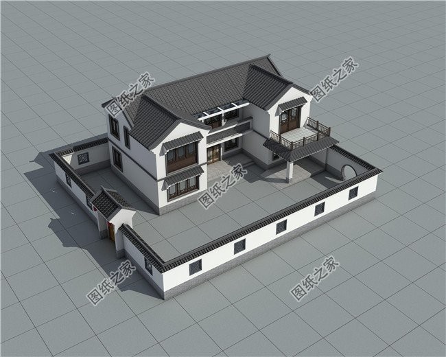 农村二层三合院别墅,古色古香的设计,带的自建房户型图方案!白墙灰瓦,静谧自然。别墅采用三合院的布局形式,中央内,两侧布置侧院,室内以客厅为中心,东西两侧功能分区明确,西侧为休息区,东侧为生活区;二层设计有四间卧室和书房,3间卧室均带有独立卫生间,提供棋牌室供娱乐,南向的露台空间方便晾晒,累了倦了还能倚靠栏杆吹吹风、看看远处的风景。整个布局都非常方正大气,空间的使用率超高。