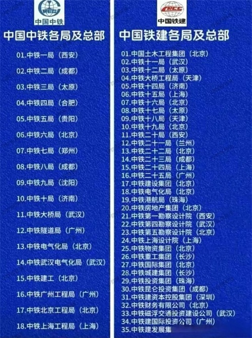 2. 组织结构与子公司:虽然两者都拥有多个工程局和子公司,但中国中铁的工程局编号从一局到十局,而中国铁建的工程局编号则从十一局到二十五局。此外,两家公司在子公司的专业领域和业务范围上也有所差异。