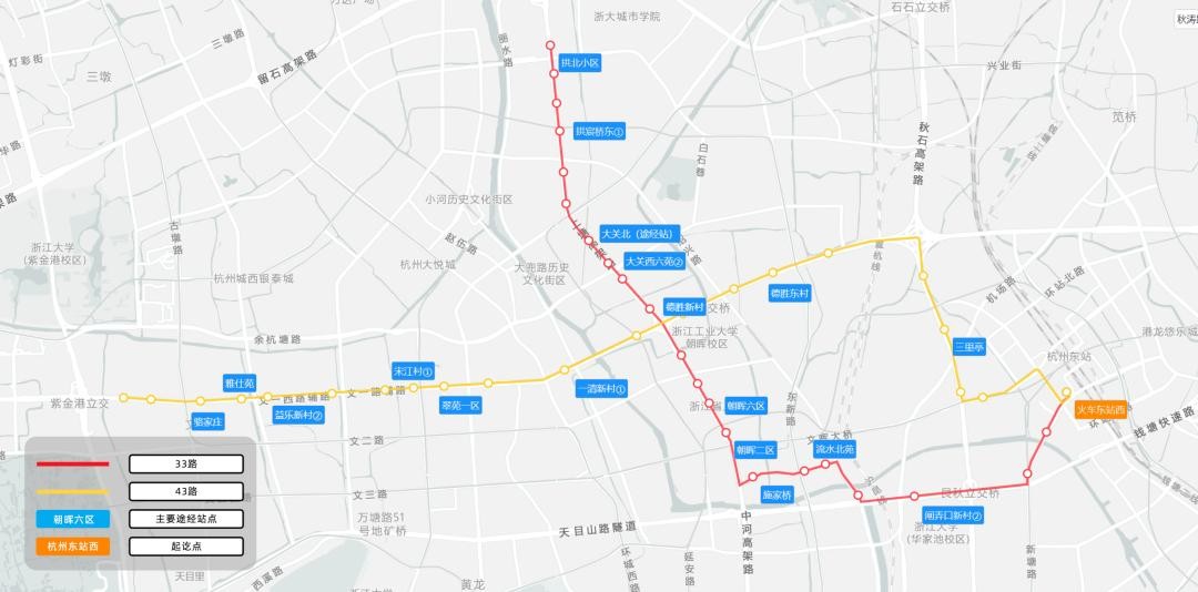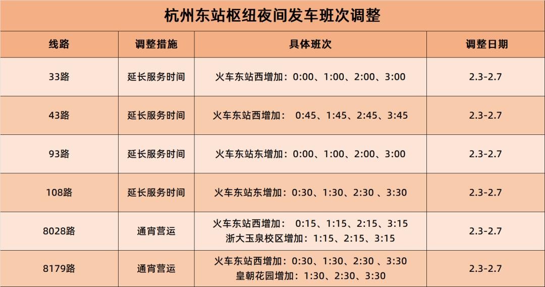 从2月3日(正月初六)起至2月7日(正月初十),杭州公交延长了从杭州东站始发的33、43、93、108路服务时间,额外增开夜间班次;夜间线路8028、8179路在2月3日(正月初六)起至2月7日(正月初十)调整为通宵营运。