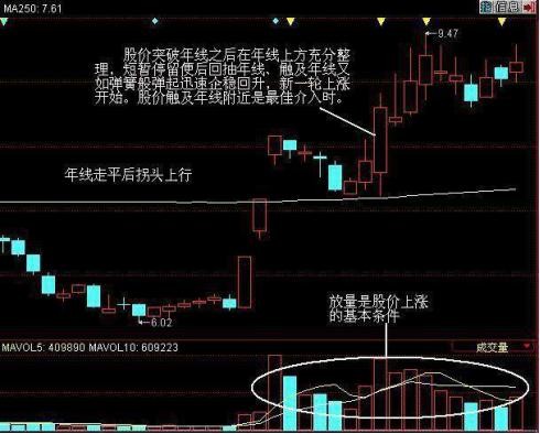 1、年线已拐头向上并且股价已站上该线之上。