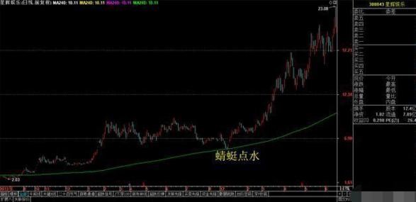 如上图,星辉娱乐年线方向向上,打到年线后受到支撑收出阳线,出现了“蜻蜓点水”形态之后,买入!随后股票暴涨124%!
