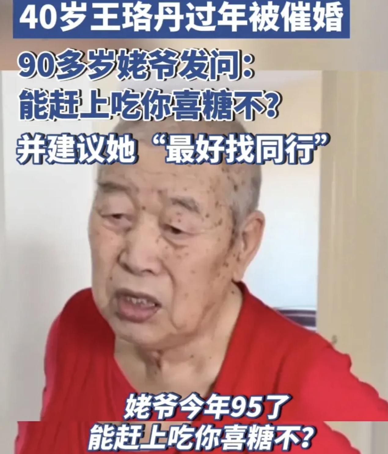2月16日,演员王珞丹(40岁)在社交平台分享了一段被95岁姥爷催婚的视频,并坦言自己也未能幸免于难,同样感受到了过年的催婚压力。