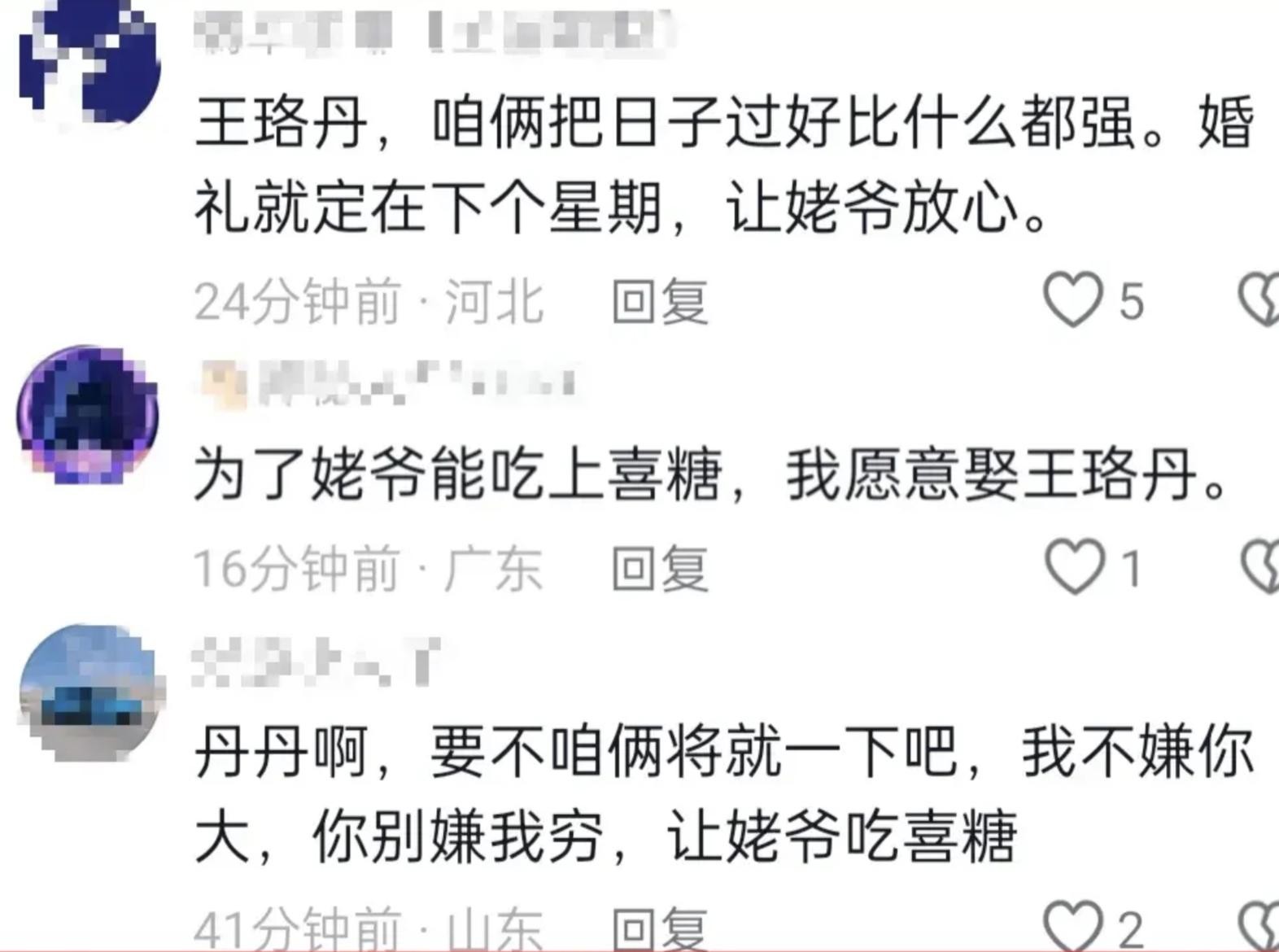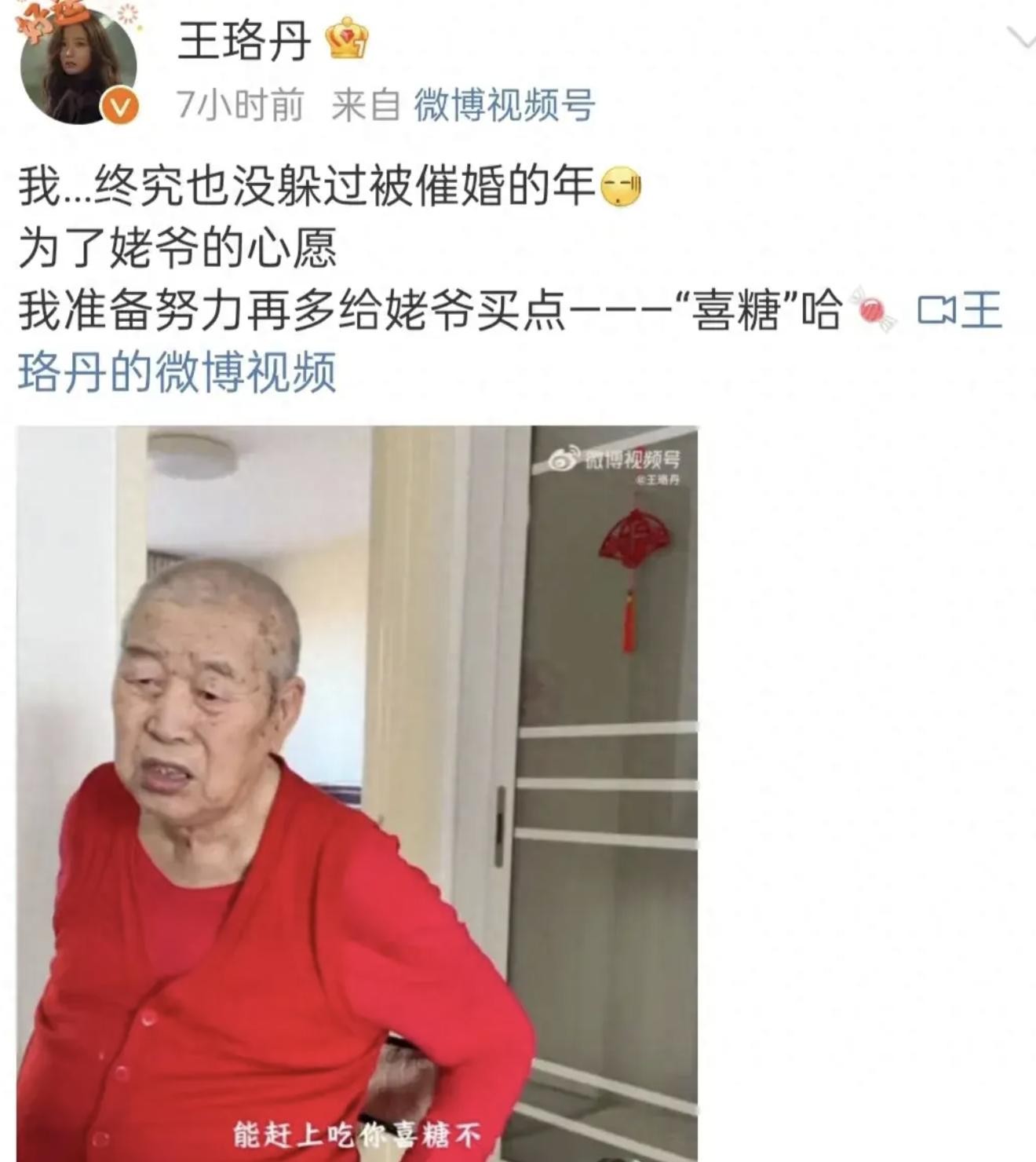 在王珞丹发的视频中,可以看出她姥爷非常严肃的询问:姥爷今年95了,能赶上吃你的喜糖不?