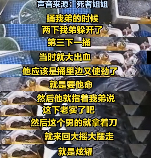 许某姐姐许女士向媒体介绍,黄某东捅了弟弟三下,前两下弟弟都躲开了,第三下就直接大出血。黄某东应该是捅进去又使劲了,就是冲着人命来的。捅完之后,他还指着许某说:“这下老实了吧!”之后没有一丝害怕,也没有拨打120求救,而是拿着刀大摇大摆的走着,向周围的商户炫耀他是如何杀人的。