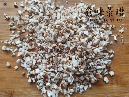 3、如果是干香菇,需要提前泡发,香菇去蒂,用开水烫一下,洗净控干水分,香菇切丁不要切的太碎,容易影响口感。