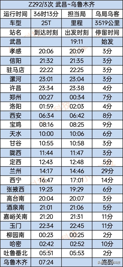 武昌站至乌鲁木齐站Z292/293次运行运行36小时13分,经停武昌、孝感、信阳、驻马店、漯河 许昌、郑州、洛阳、西安、宝鸡、天水、甘谷、陇西、定西、兰州、西宁、张掖西、高台南、酒泉南、嘉峪关南、玉门、柳园南、哈密、吐鲁番北、乌鲁木齐。