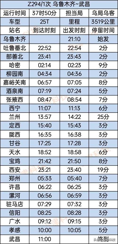 乌鲁木齐站至武昌站Z294/291次全程运行37小时50分,经停乌鲁木齐、吐鲁番北、部善北、哈密 柳园南、嘉峪关南、泉南、张掖西、西宁、兰州、定西、陇西、甘谷、天水、宝鸡、西安、郑州、许昌、漯河、驻马店、信阳、广水、孝感、武昌。