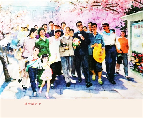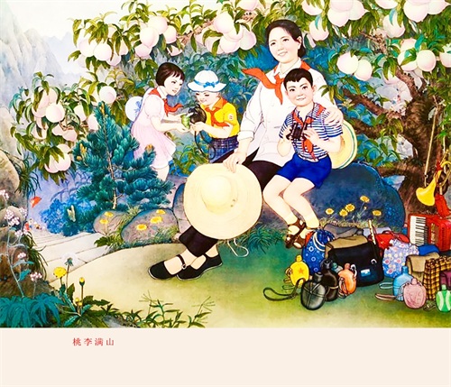 2.解读、赏析:这幅年画作品的标题为《桃李满山》,由画家张为民、刘淑荣创作,1982年出版。