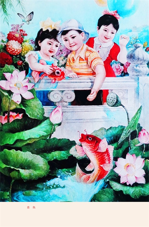 荷花盛开鱼欢跳,三孩喜鱼心欢笑。这幅年画作品表现了孩子们美好幸福的童年生活,同时也寓意着连年有余、富贵满堂,生活一年更比一年好。