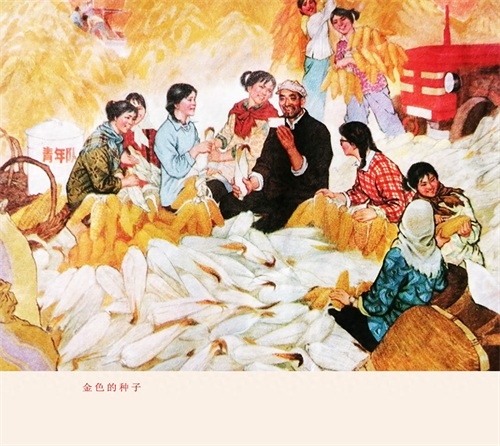 1.解读、赏析:这幅年画作品的标题为《金色的种子》,由画家刘福臣、刘庆福创作,70年代出版。