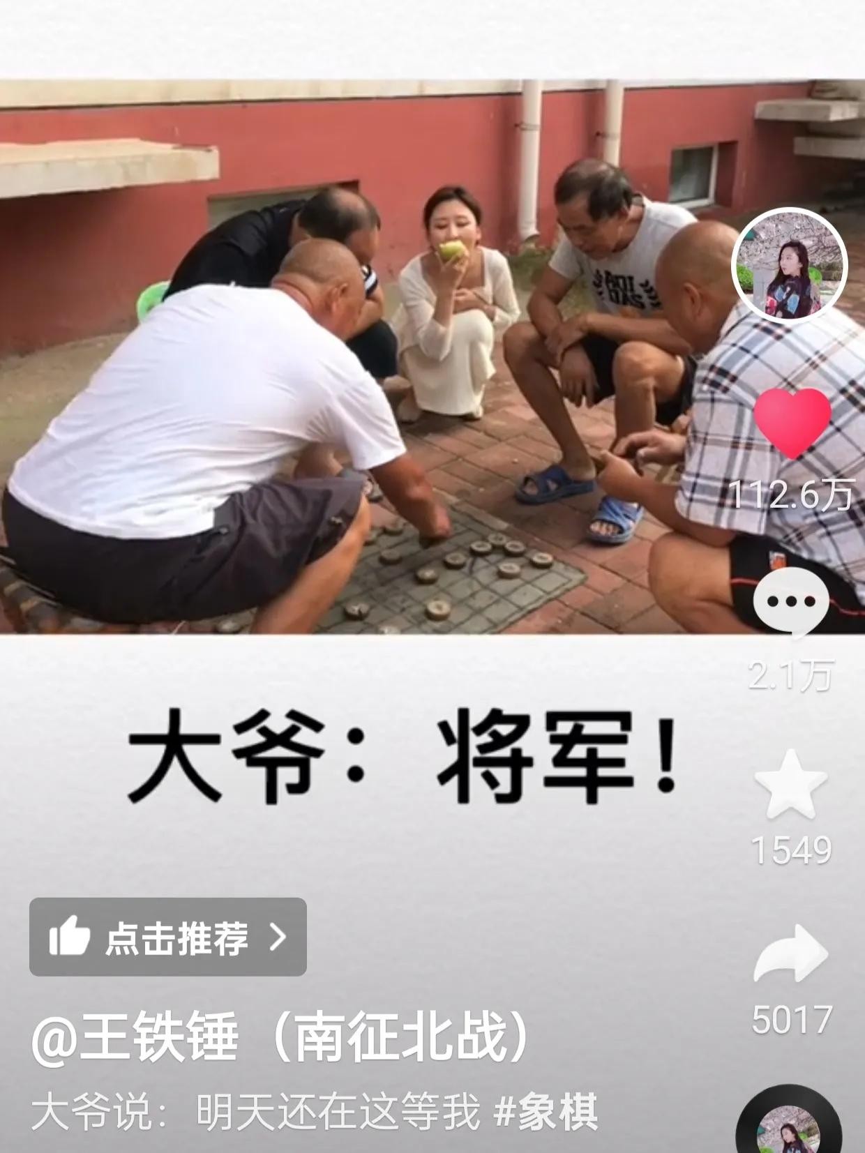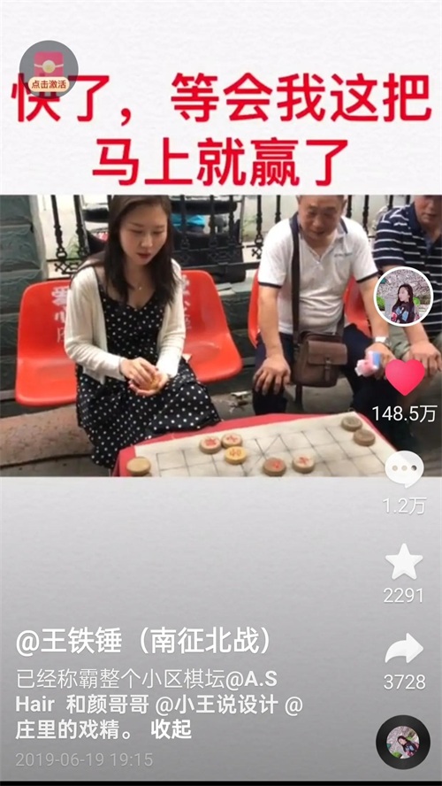 2019年6月19日,她在上传了一条和老大爷下象棋的视频以后,一下子火爆,获赞超百万,目前是148.5万。