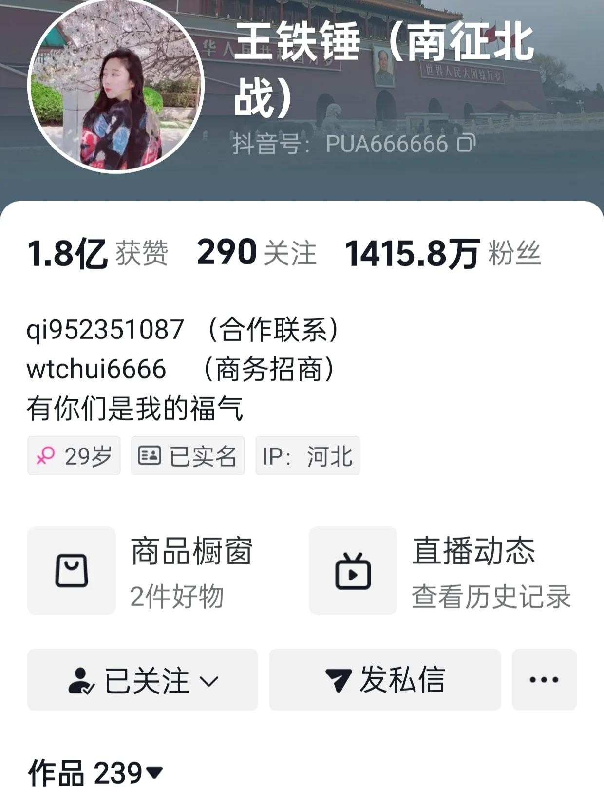 截至2024年11月27日,账号共发布239个作品,收获粉丝1415.8万,获赞1.8亿。