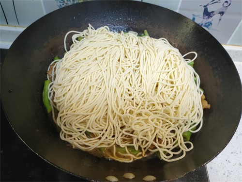 5、然后我们把新鲜的面条整齐、均匀地铺在上面,盖上锅盖,转中火,先焖5分钟。