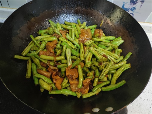 3、炒出酱香味以后加入豆角,翻炒2分钟,炒出豆角的清香味。豆角一定要多炒一会,这样焖好以后会更加好吃。