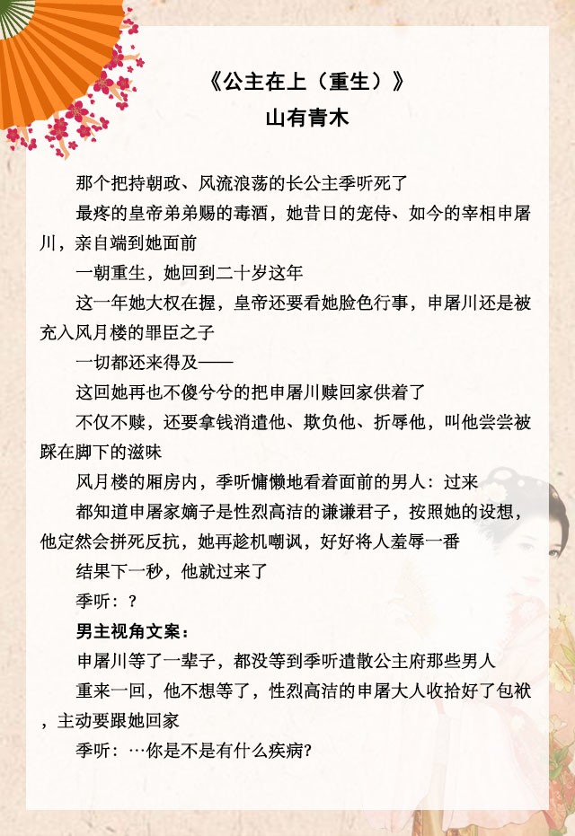 短评:古言双重生甜宠文,宫廷侯爵。女主是顾命公主,把持着朝政,最后因为功高震主被身为九五之尊的弟弟给毒死了。男主前世曾经是女主的宠侍,两人纠缠十几年,女主始终爱而不得,其实男主一直在等着女主清理掉她后院里面的美男,可惜到死都没能等到。