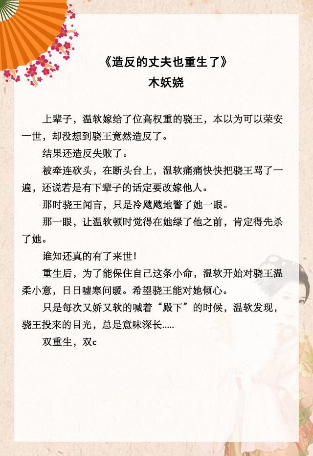 短评:古言双重生甜宠文,破镜重圆。前世,男女主夫妻七年,但因为两人的性格都存在一些缺陷,且有一堆极品从中作梗,导致他们夫妻二人渐行渐远,感情慢慢消磨殆尽。在宫变之中,女主被男配女配合谋杀死,女主误以为是男主下令要弄死她,带着滔天的恨意和不甘重生。