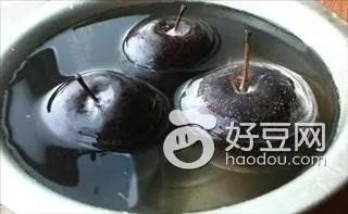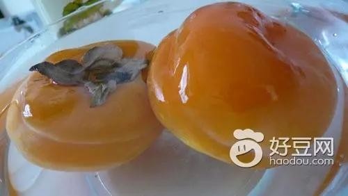 以上三图,依次是:冻梨、冻柿子、冻黄桃。吃的时候一定要泡在冷水里化一下,所以才有泡在水时的图片噢。
