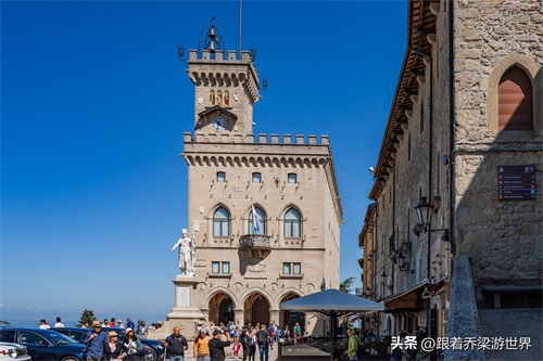 自东城墙观景台向西上行约百米,就是圣马力诺的共和宫。其国家的最高权力机构也就在这里,门口有卫兵持枪站岗。但很随和,游客可以与其随便拍照。但不能进入里面参观。这样一个小地方,是如何成为一个国家的呢?站在共和宫门口,我在想。