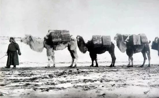行进中的运送茶叶的骆驼商队。摄影:米克洛斯,1909年