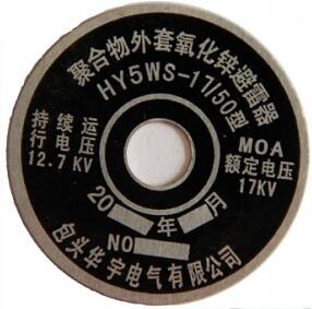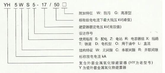 如上图,HY5WS-17/150型,HY表示凝合物外套氧化锌避雷器,无间隙,配电型,额定电压为17kV、标称放电电流下残压50kV,标称放电电流5kA。