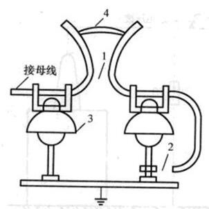常用的角形保护间隙(1-主间隙,2-辅助间隙,3-绝缘子;4-电弧)