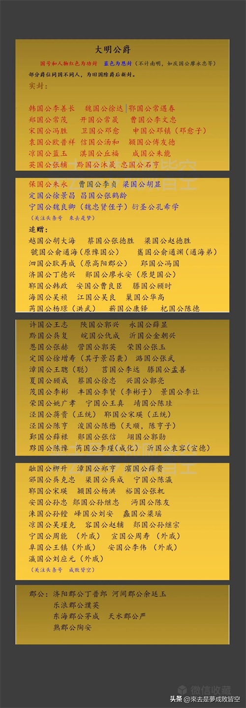 明朝郡公,郡侯,县子,县男是建国前功臣追封的爵位,建国后革除。其中郡公只有六位(一位郡改国),前文有过详细介绍,所以在此不做详细讨论,本文明朝功臣爵位中的第一等国公与大家详加探讨。